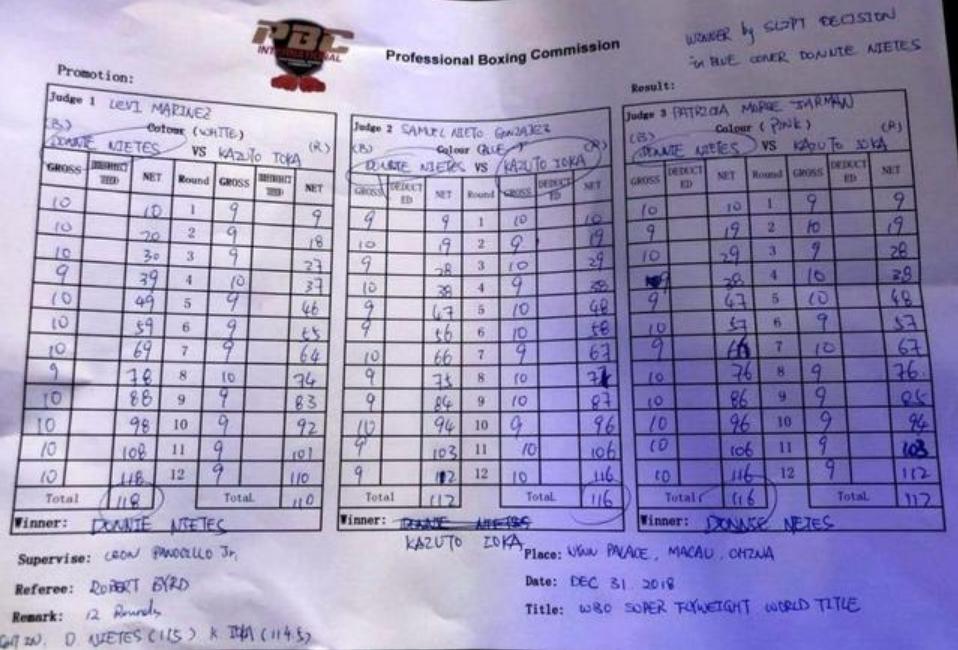 2-1のスプリットデシジョンで僅差ですがドニーニエテスの勝利で4階級制覇達成!