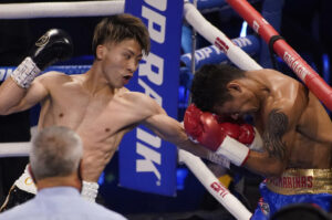 さらにダスマリナスは右のフック気味のジャブを放ったら、また尚弥が左をのカウンターで合わせてきてあともう少し深く当たっていたらそこで終わっていたのでは?と思うほどの尚弥の左オーバーハンドフック、これで完全にダスマリナスは後手後手に回りましたね