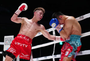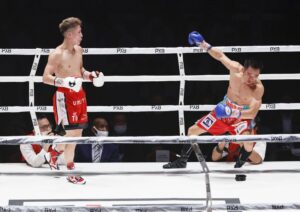 7ラウンド、尚弥連続攻撃からの右フックがディパエンのテンプルをとらえガクっと来る、ここでラッシュ。だがディパエンまた耐えるが疲労が見えてきた。尚弥左右のボディー、右フックをお見舞いする。